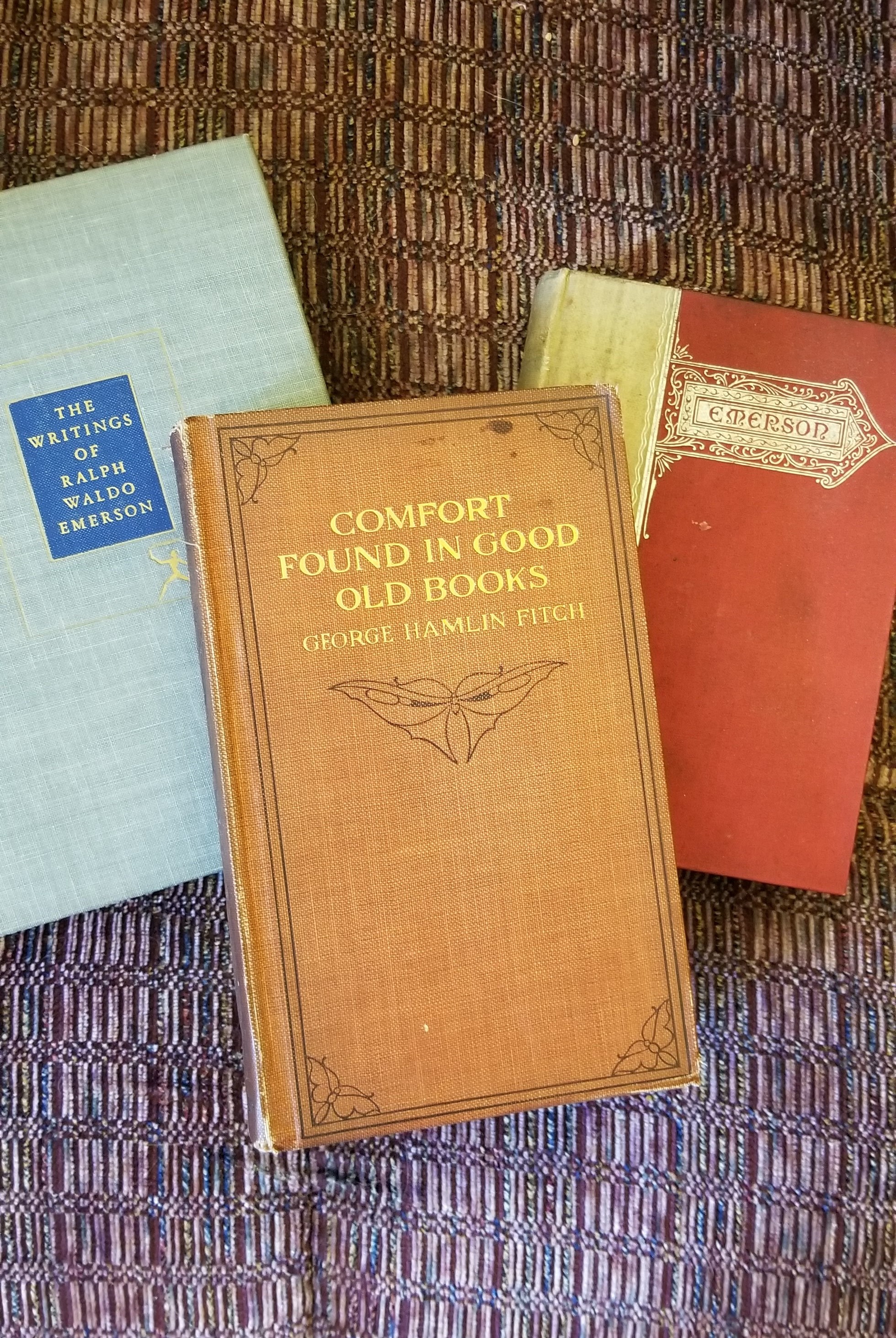 I do not own a kindle or any type of reader. And right now I have no need to. Every room in our home has books in it, and most rooms’ walls are lined with book shelves. Cookbooks and cooking magazines in the sunroom; poetry, non-fiction, ecology, British Romanticism, early American texts in the living room; fiction, philosophy, art, mythology, gender studies, travel, reference, language in the den; teaching materials and textbooks in the spare bedroom; literary critcism, poetry anthologies, and books that currently have my attention in my office; books Rob is working with in his office–every room of our house has a different purpose. In our bathroom catalogs from presses, pages left open for the other to read; in the bedroom this month’s Atlantic, Smithsonian, National Geographic, and Mother Jones along with my current night reading, dream dictionaries, two old copies of Emerson’s essays (one from 1893, one from 1940), and one copy of the unique Comfort Found in Good Old Books by one George Hamilton Fitch (1911)–all three that Rob gave me one year as a birthday gift.